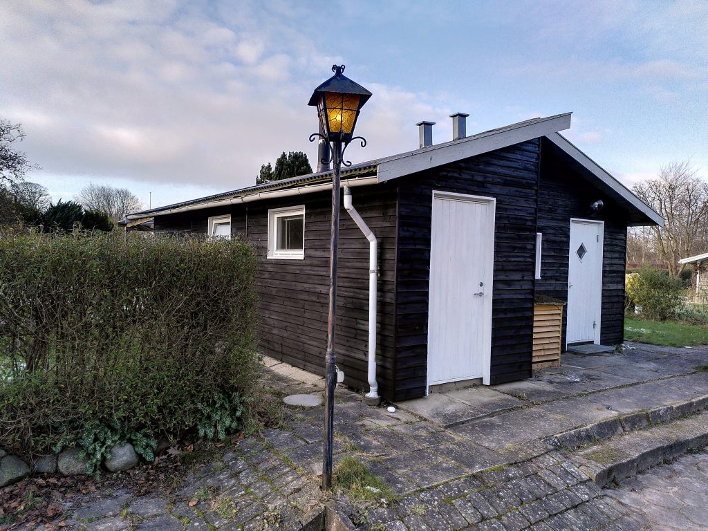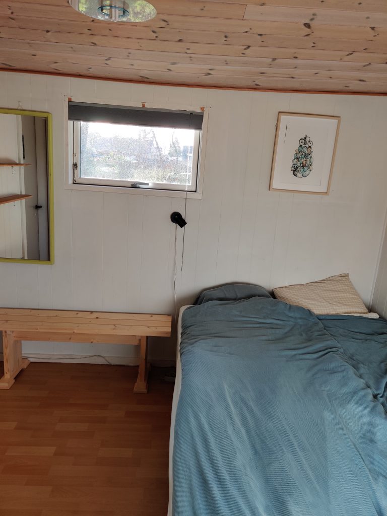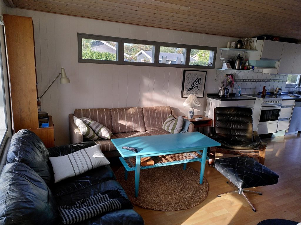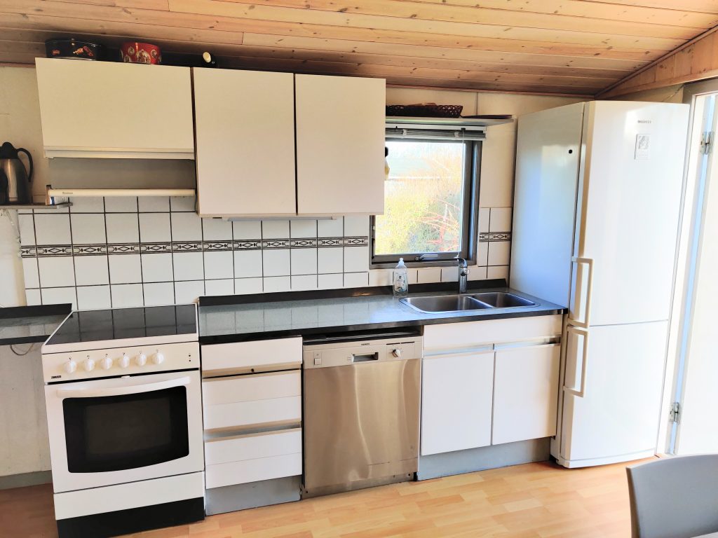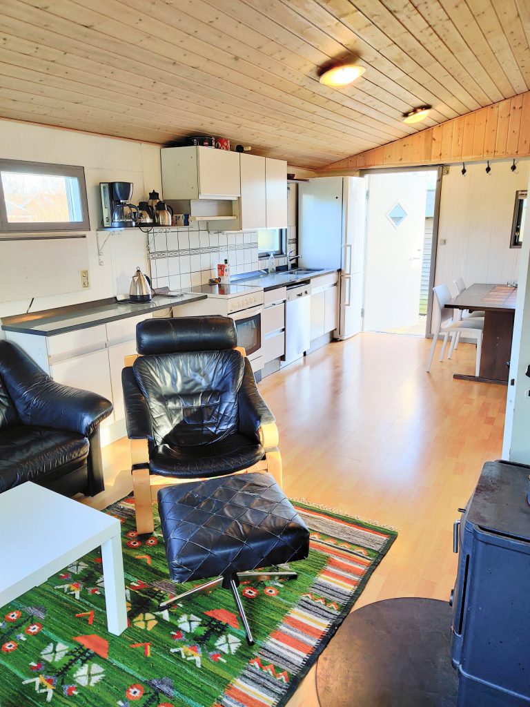 Sommerhuset er på 46 kvm og indeholder køkken med komfur, opvaskemaskine, køleskab og skabsfryser. Der er stole og service til 6 personer. Stuen er i et med køkkenet og har brændeovn. Der er et værelse med en 140 cm bred seng og en enkelt seng på 80 cm. Der ud over er der en 180 cm bred seng i et indhak i stuen. Der er badeværelse med bruser og ældre vaskemaskine og tørretumbler . Foran huset er der en overdækket terrasse på 20 kvm.
